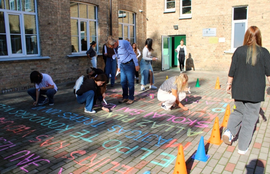 Trešdien,18.septembrī atzīmējām dzejas dienas . Skolas pagalmā ar krāsainiem krītiņiem 4.-12. klases skolēni rakstīja Imanta Ziedoņa dzejoli “Jubilejā”, kuru dzejnieks 1994. gadā ir veltījis Kalnciema skolai. Visi skolēni zīmēja ar krāsainiem krītiņiem savas rociņas uz pagalma bruģīša , kā apliecinājumu-balsojumu dalībai KiVa programmā. KiVa programma iesaista skolēnus un mudina domāt un rīkoties tā , lai 365 dienas izvairītos no pāridarījumiem. Trešdien visa skola pulcējās arī skolas pagalmā, rotājušies dzimšanas dienu cepurītēs un kopīgi baudījām svētku torti.