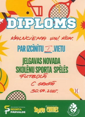 30.septembrī Jelgavas novada skolēnu sporta spēlēs futbolā C grupā ( 6. un 7.klase) Kalnciema vidusskolas jaunie futbolisti izcīnīja 1.vietu.