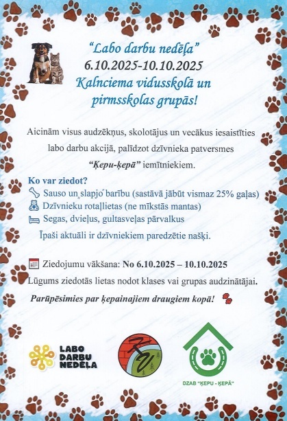 Atsaucoties satraucošajai ziņai, Kalnciema vidusskolas pirmsskolas grupu audzēkņi un vidusskolas skolēni piedalījās akcijā . Saziedotas tika segas, dvieļi, matrači, dzīvnieku rotaļlietas, gan sausā, gan sausā barība. Paldies sakām visām ģimenēm par labo sirdi un atsaucību! Patversmes vadītāja bija patiesi pateicīga tik plašam atbalstam.