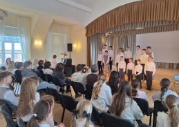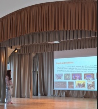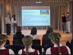 Kalnciema vidusskolas 8. klases skolēni iepazīstina viesus ar mūsu skolas tradīcijām un ikdienu, savukārt spāņu skolēni prezentē savas tradīcijas un stāsta par savu skolu.