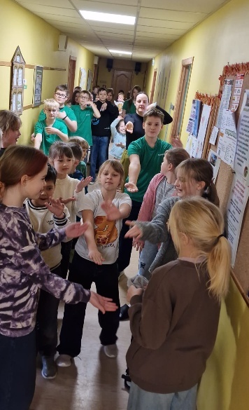 Tikko kā atskanēja pazīstamais ritms, piektklasnieki sāka demonstrēt kustības, un jau pēc pirmajām sekundēm 1.–3.klašu skolēni pievienojās ar milzīgu entuziasmu. Gaisā virmoja smaidi, smiekli un prieks – rokas ritmā dejoja, kājas soļoja, un pat tie, kuri sākumā tikai noskatījās, drīz vien dejoja līdzi no sirds!
